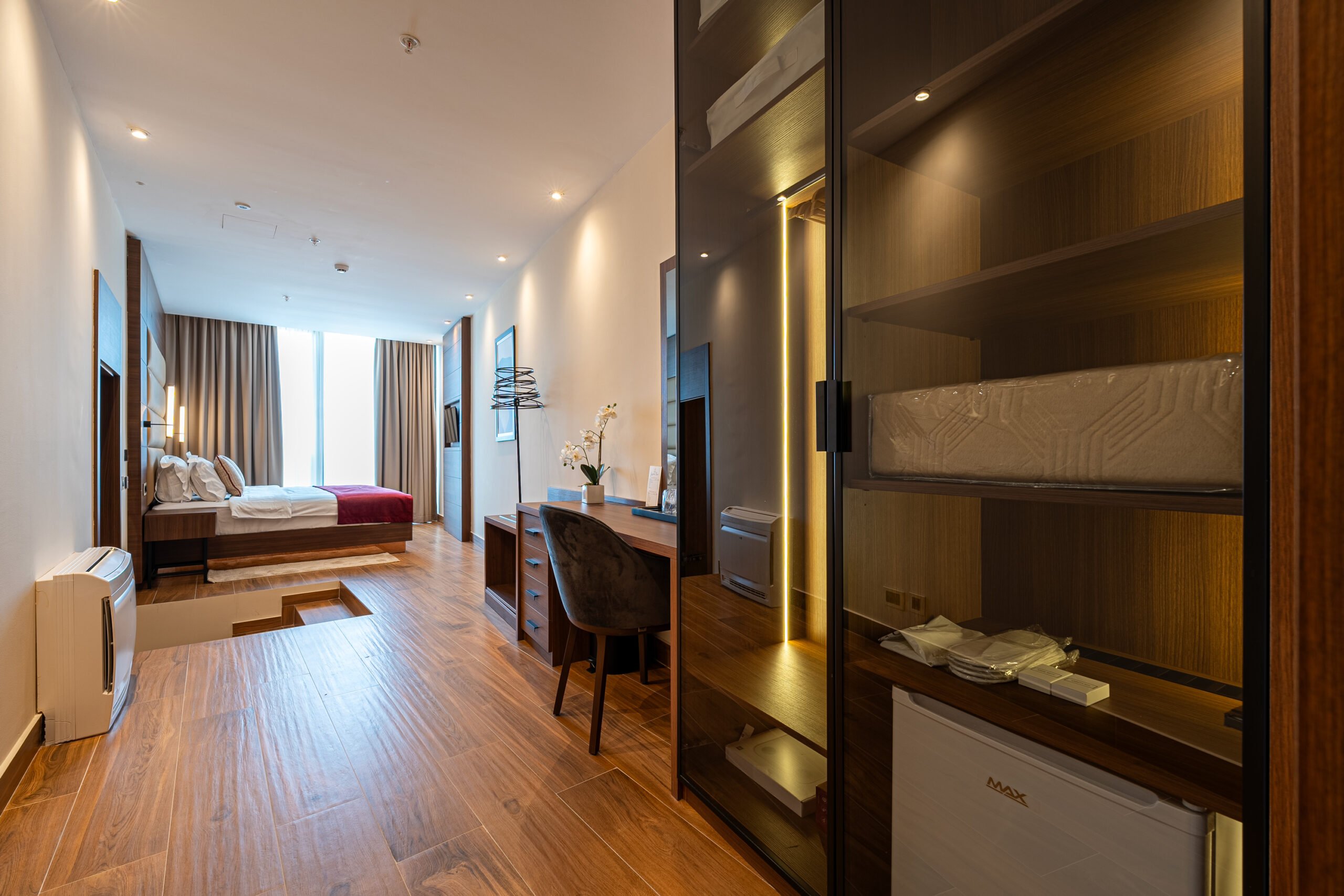 As you enter your room, you’re immediately greeted by the soft glow of natural light streaming in through the large window, offering a captivating view of the shimmering lake and the lush greenery that surrounds it. The ever-changing panorama outside provides a mesmerizing backdrop to your stay, inviting you to unwind and reconnect with nature. Your room is elegantly appointed with modern furnishings and tasteful décor, creating a cozy and welcoming ambiance. A comfortable queen-sized bed takes center stage, promising a restful night’s sleep after a day of exploration.